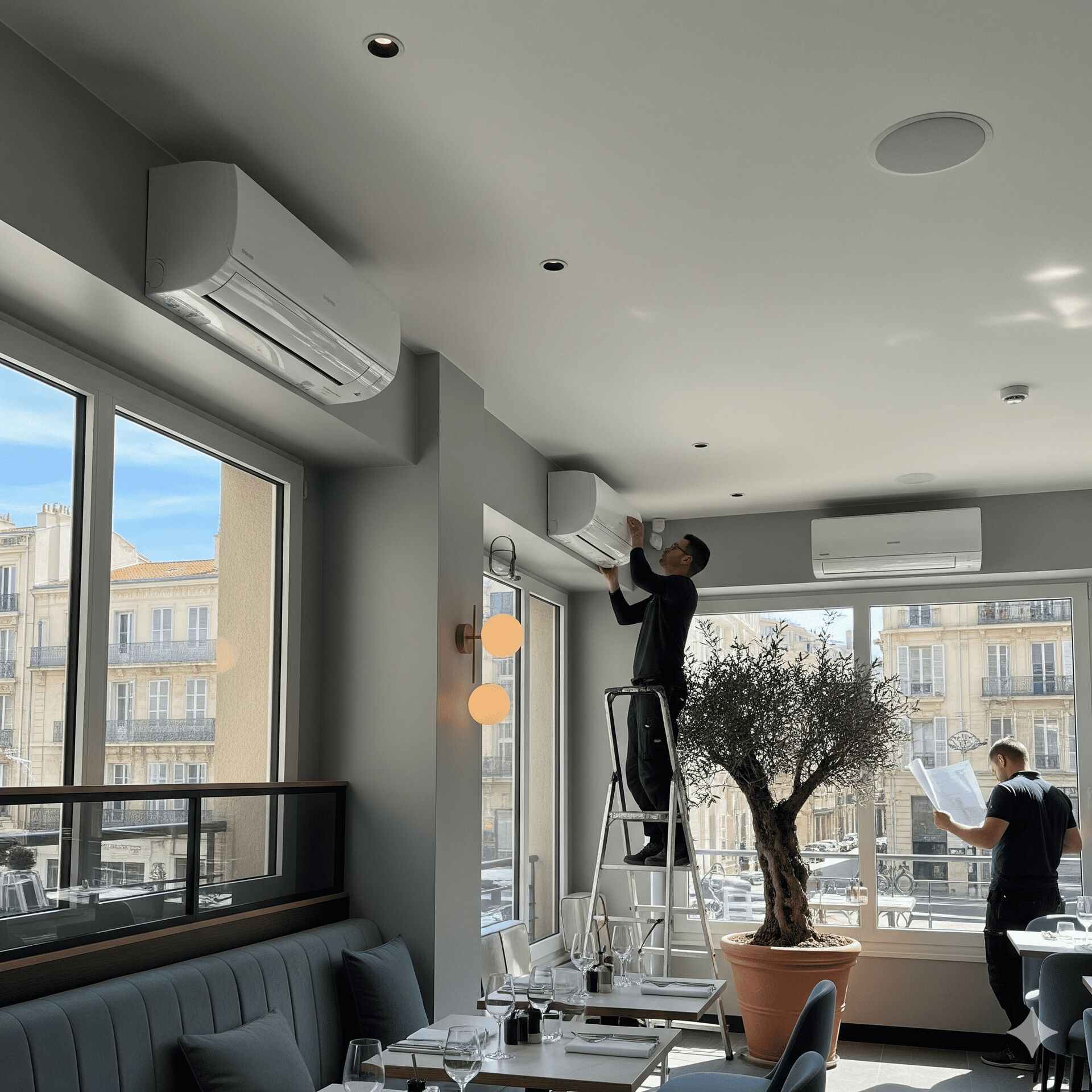 Nos techniciens posent des climatiseurs multi split Daikin ou Mitsubishi, discrets et silencieux. Chaque unité intérieure est configurée pour optimiser le confort des zones de service, salles à manger ou cuisines.